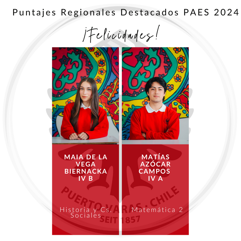 Felicitamos a nuestros estudiantes Maia de la Vega Biernacka por su puntaje en las pruebas de Historia y Ciencias Sociales y a Matías Azócar Campos por su puntaje en la prueba de Matemática 2, quienes obtuvieron el reconocimiento “distinción a la trayectoria educativa en su categoría de territorios” al ser los puntajes más altos de la región de Los Lagos.